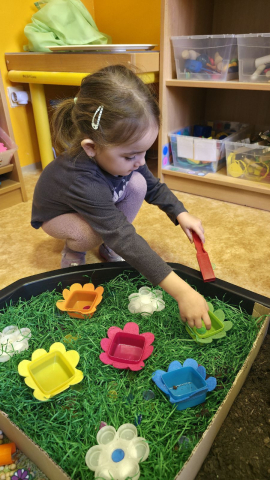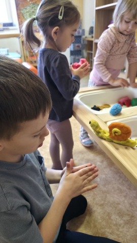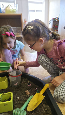 V další části měsíce jsme se zaměřili na jaro. Povídali jsme si o změnách v přírodě, o počasí i o tom, co se na jaře děje. V „Písečné pláži“ si děti hrály na malé zahradníky – pracovaly s hlínou, sázely do květináčů, využívaly umělé květiny i modely hmyzu. Tvořily, zkoušely, přesýpaly, modelovaly z modelíny a objevovaly jarní témata pomocí smyslových her.